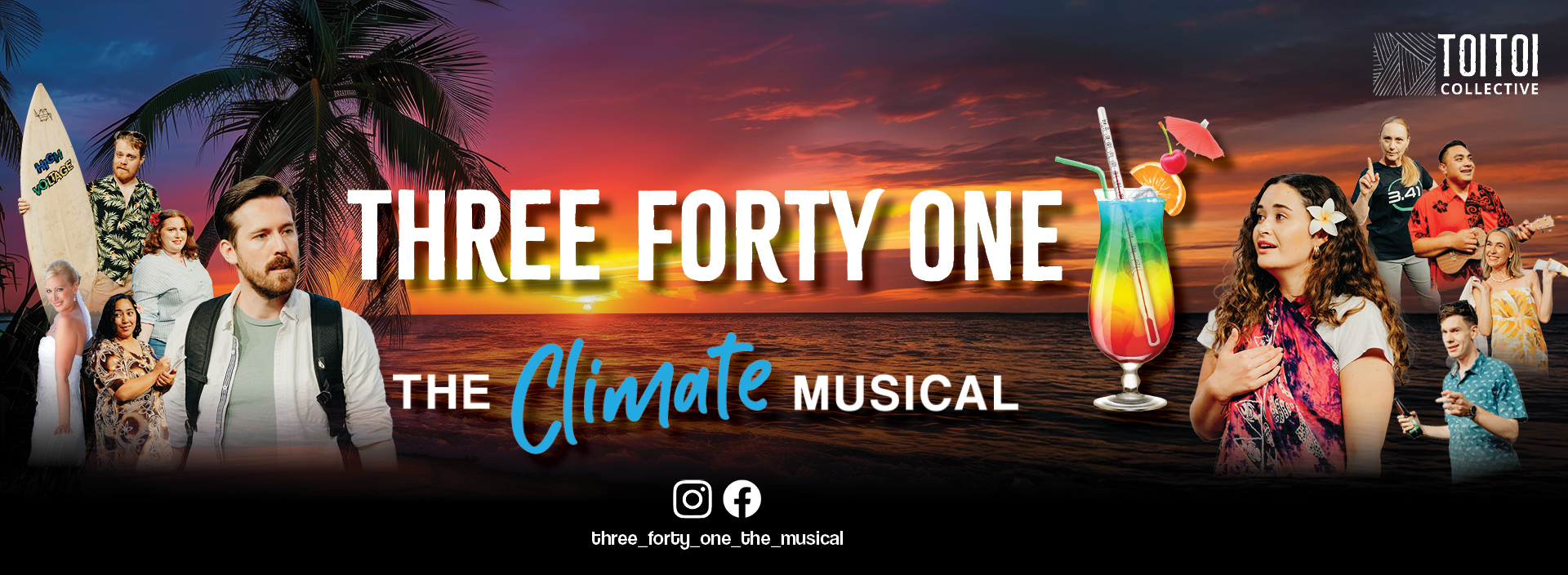 Welcome to the resort! On an island like the islands of Tuvalu, a kiwi wedding party arrive for the time of their lives, unaware that life altering realities await them. With a compelling script, a standout cast and songs that range from hilarious to heart breaking, THREE FORTY ONE addresses the climate crisis, considering it through the eyes of those most affected. This show is dedicated to the people of the world’s many coastal regions being increasingly affected by extreme weather and sea level rise. Theirs is a story that needs hearing and responding to, before it’s too late.